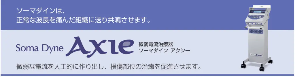 「ソーマダイン」微弱電流を通電することにより損傷部分の細胞組織のミトコンドリアで生成されるアデノシン三燐酸(ATP)を増大させることにより蛋白質の合成が促進され組織の修復が早まり、症状が回復していきます。